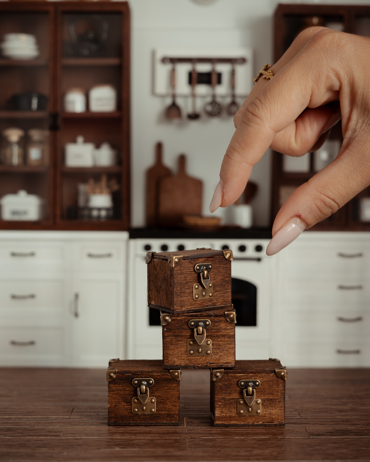 Este baúl de madera a escala 1:12 está cortado, ensamblado y pintado a mano en tono marrón oscuro, lo que le aporta profundidad y un carácter más rústico. Los herrajes decorativos completan su diseño y refuerzan su estilo artesanal.