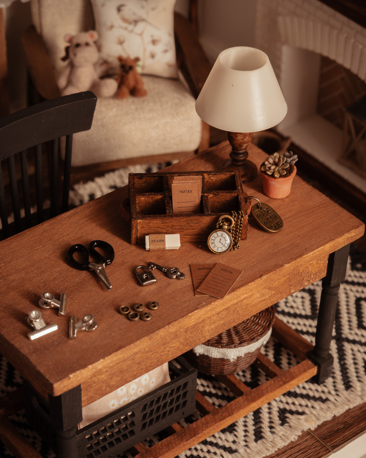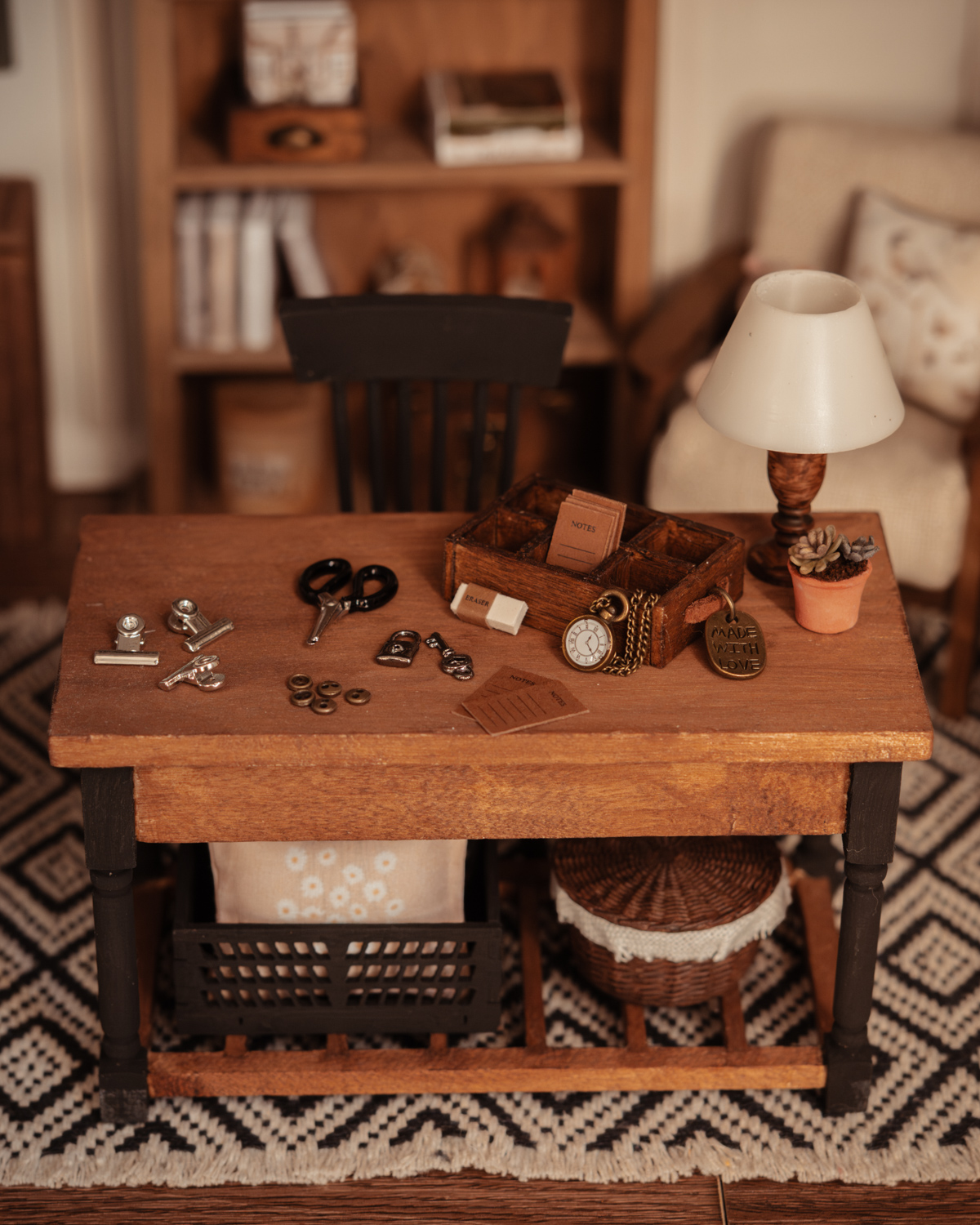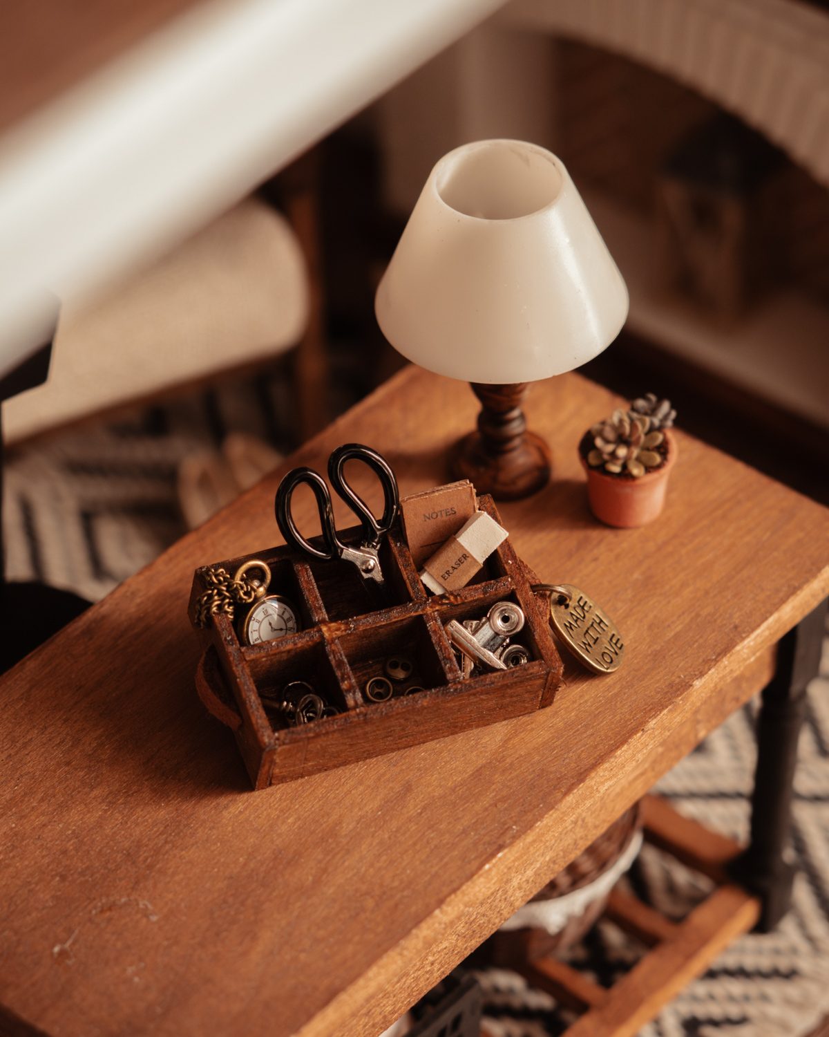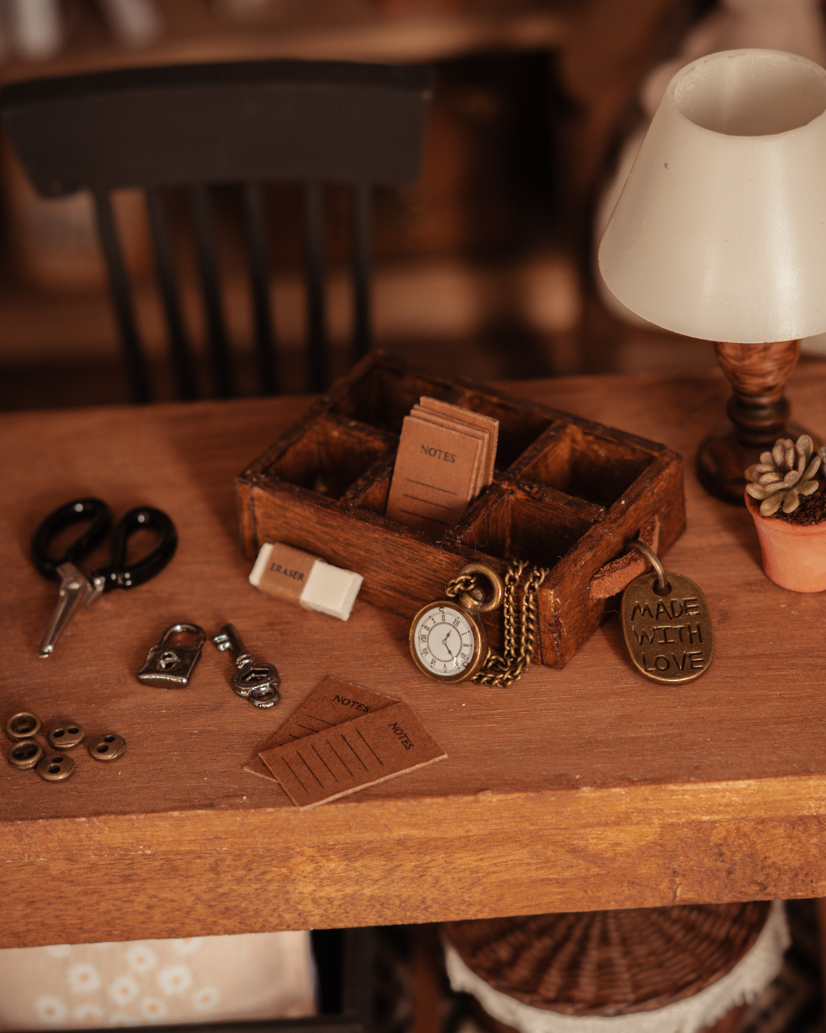 Cajón organizador craft en miniatura escala 1:12, hecho a mano en madera con acabado rústico marrón oscuro. Incluye accesorios de manualidades y papelería como tijera, bloc, clips, botones y reloj con cadena. Ideal para casa de muñecas y escenas de craft room, aportando realismo y detalle artesanal.