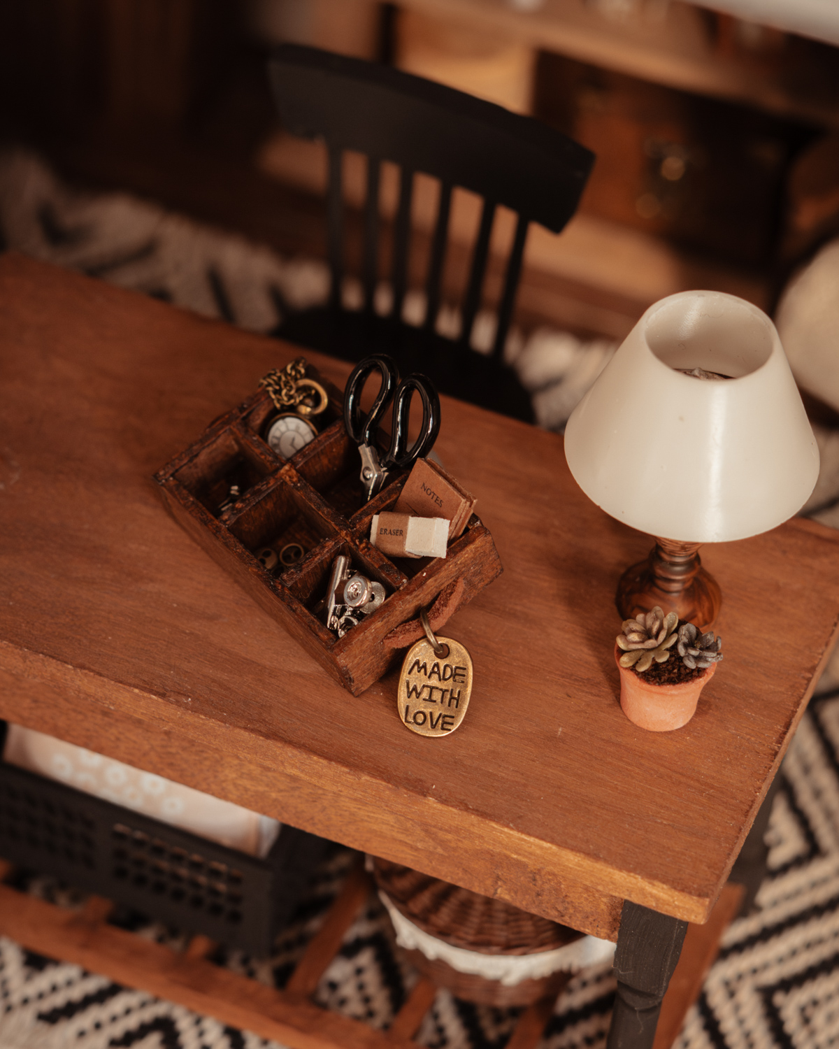 Este cajón organizador craft a escala 1:12 está cortado, ensamblado y pintado a mano en un tono marrón oscuro de estilo rústico. Cuenta con seis compartimentos, dos tiradores de terciopelo en los laterales y un pequeño llavero de bronce con la inscripción “made with love” en uno de los tiradores, aportando un detalle delicado y especial.
