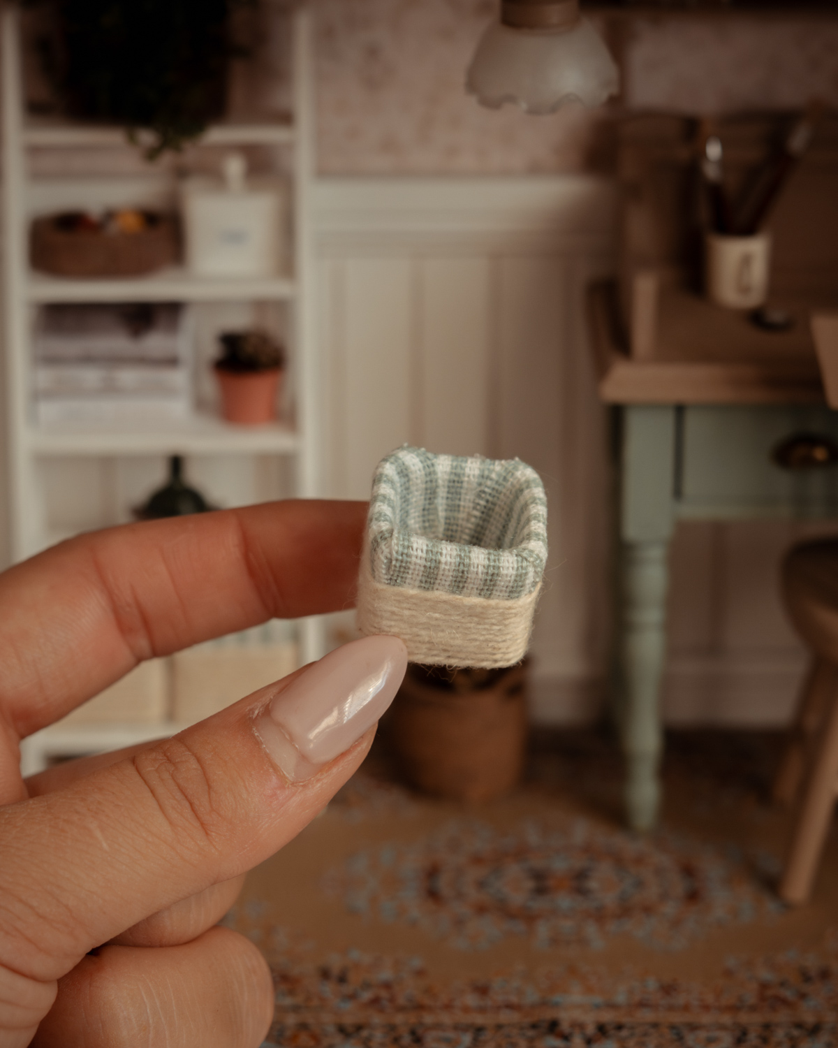 Cesta de rayas en miniatura escala 1:12, hecha a mano con tela verde y beige y acabado artesanal efecto mimbre. Ideal para casa de muñecas, perfecta como almacenaje decorativo en estanterías, cocina o craft room. Aporta estilo rústico farmhouse, textura y realismo a tus escenas en miniatura.