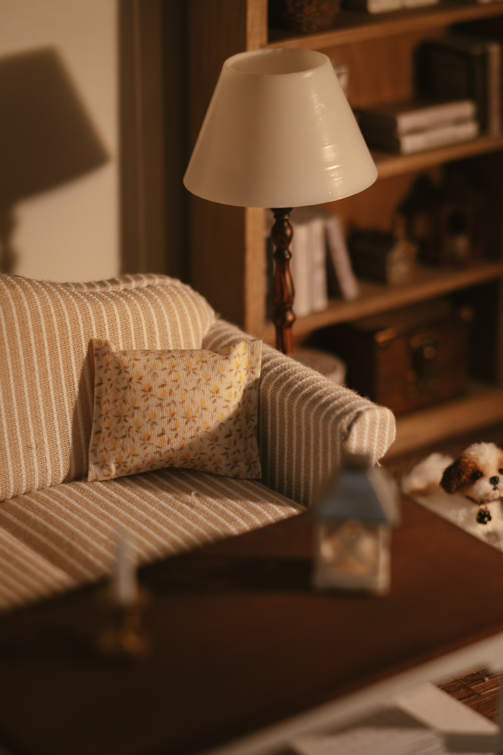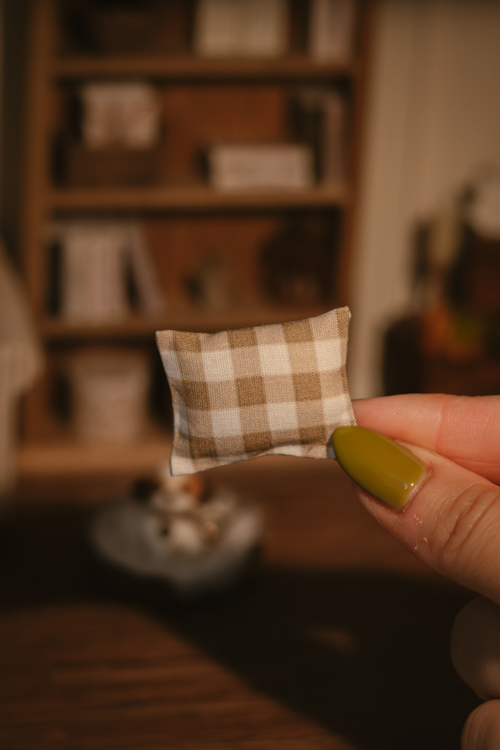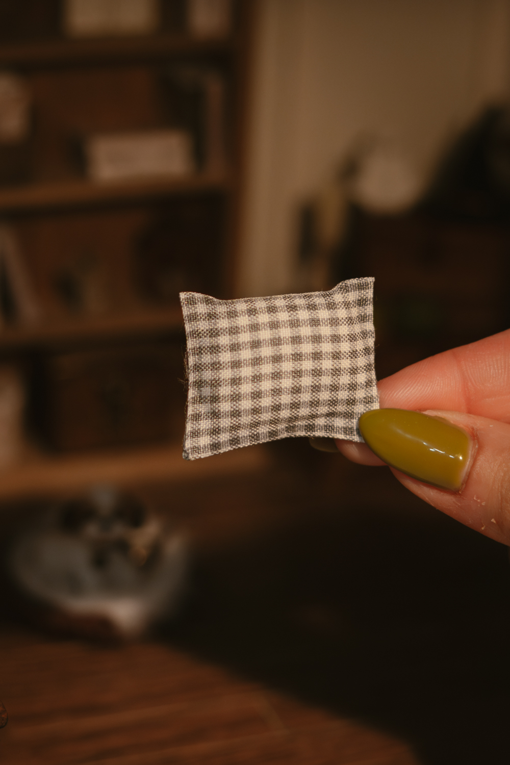 Se puede colocar sobre sofás, sillas, camas, dentro de cestas o en estanterías, creando rincones cálidos y llenos de encanto en cualquier estancia de tu casa de muñecas.