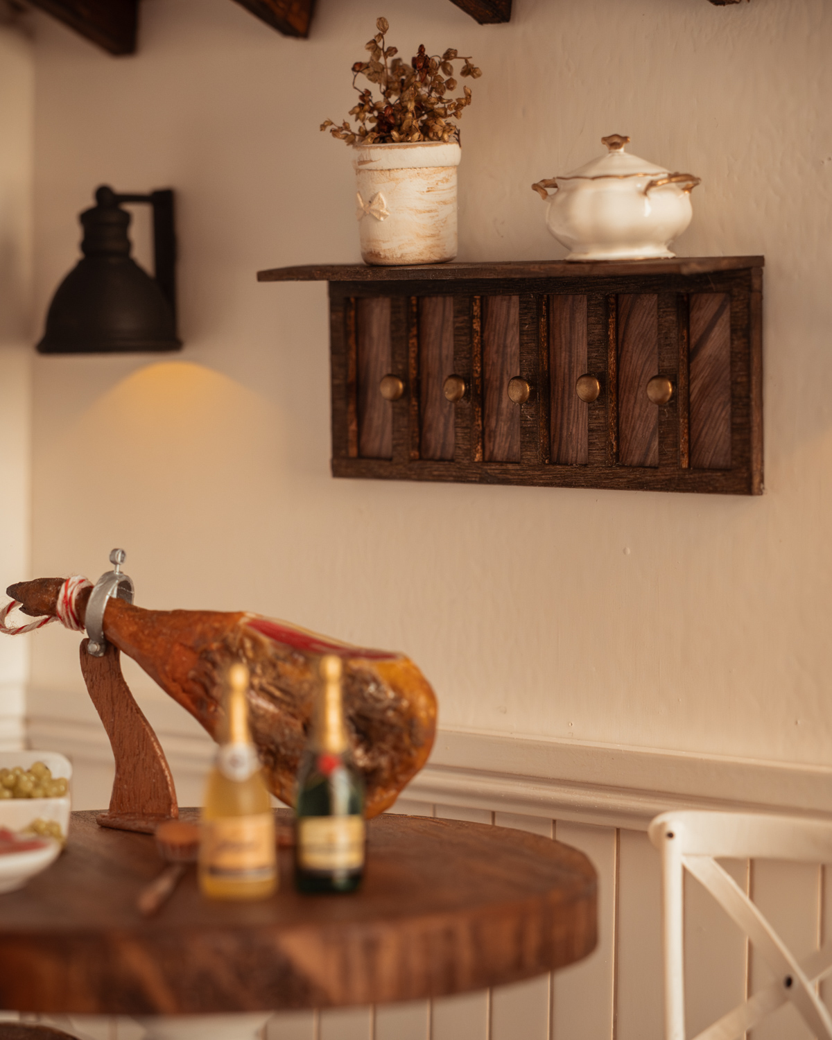 Perchero de pared con estante en miniatura escala 1:12, hecho a mano en madera y cartulina con estilo rústico farmhouse. Incluye ganchos para colgar accesorios en miniatura y estante superior. Ideal para casa de muñecas, aporta realismo, funcionalidad y encanto a cualquier escena en miniatura.