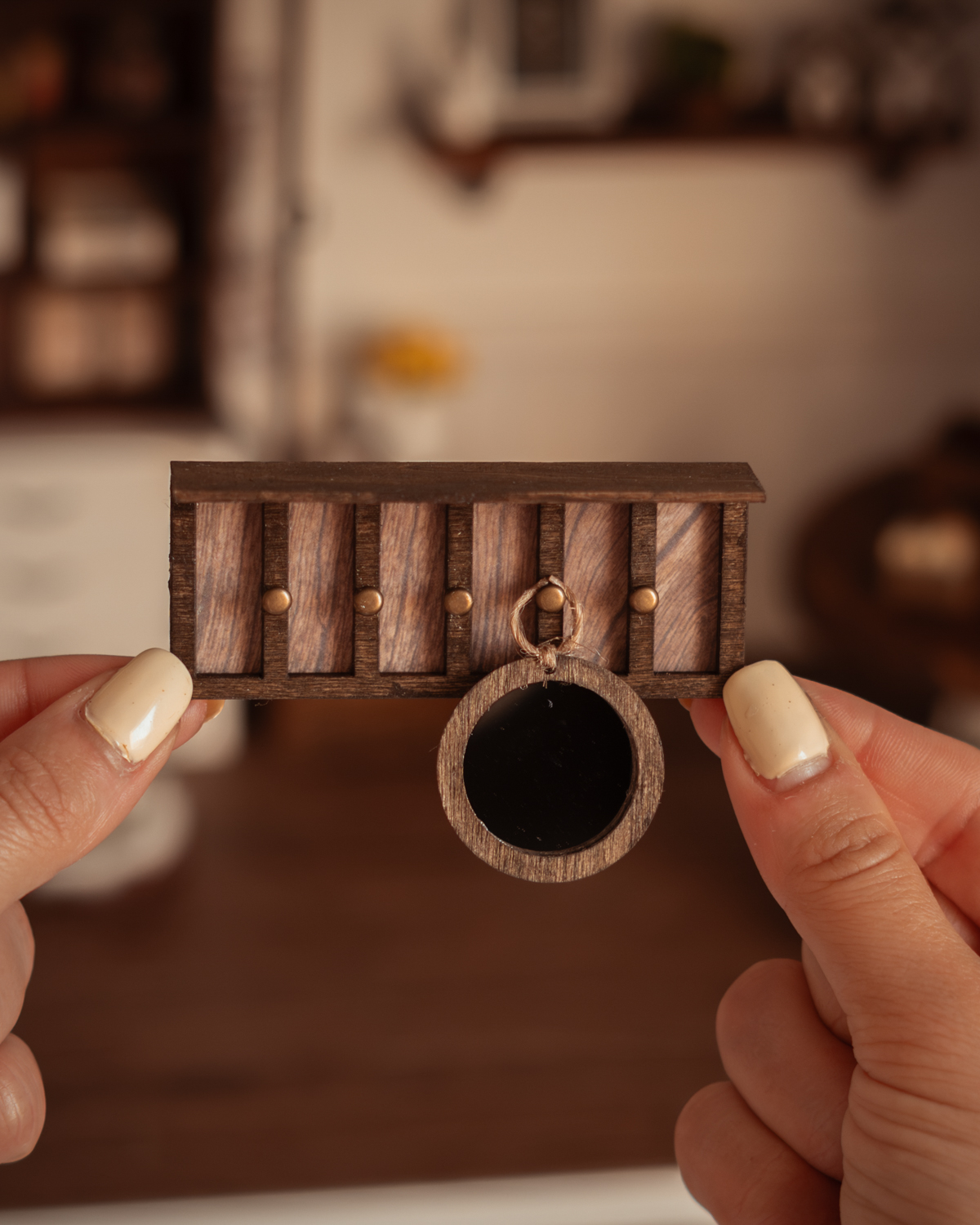 Este perchero a escala 1:12 está confeccionado en madera y cartulina, cortado y pintado a mano en marrón oscuro, con un estilo rústico y farmhouse. Incluye un estante superior y varios ganchos de pared para colgar accesorios en miniatura, como bolsos, bolsas, bufandas, espejos o decoraciones variadas.