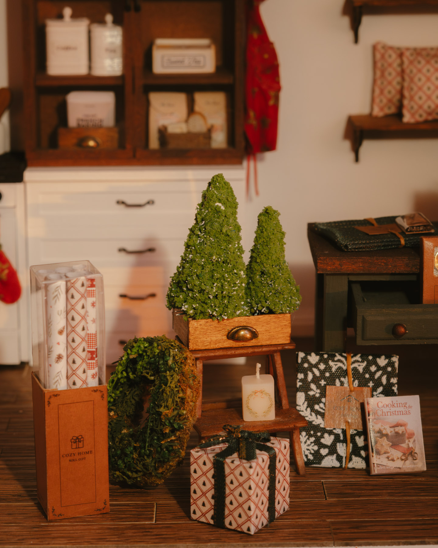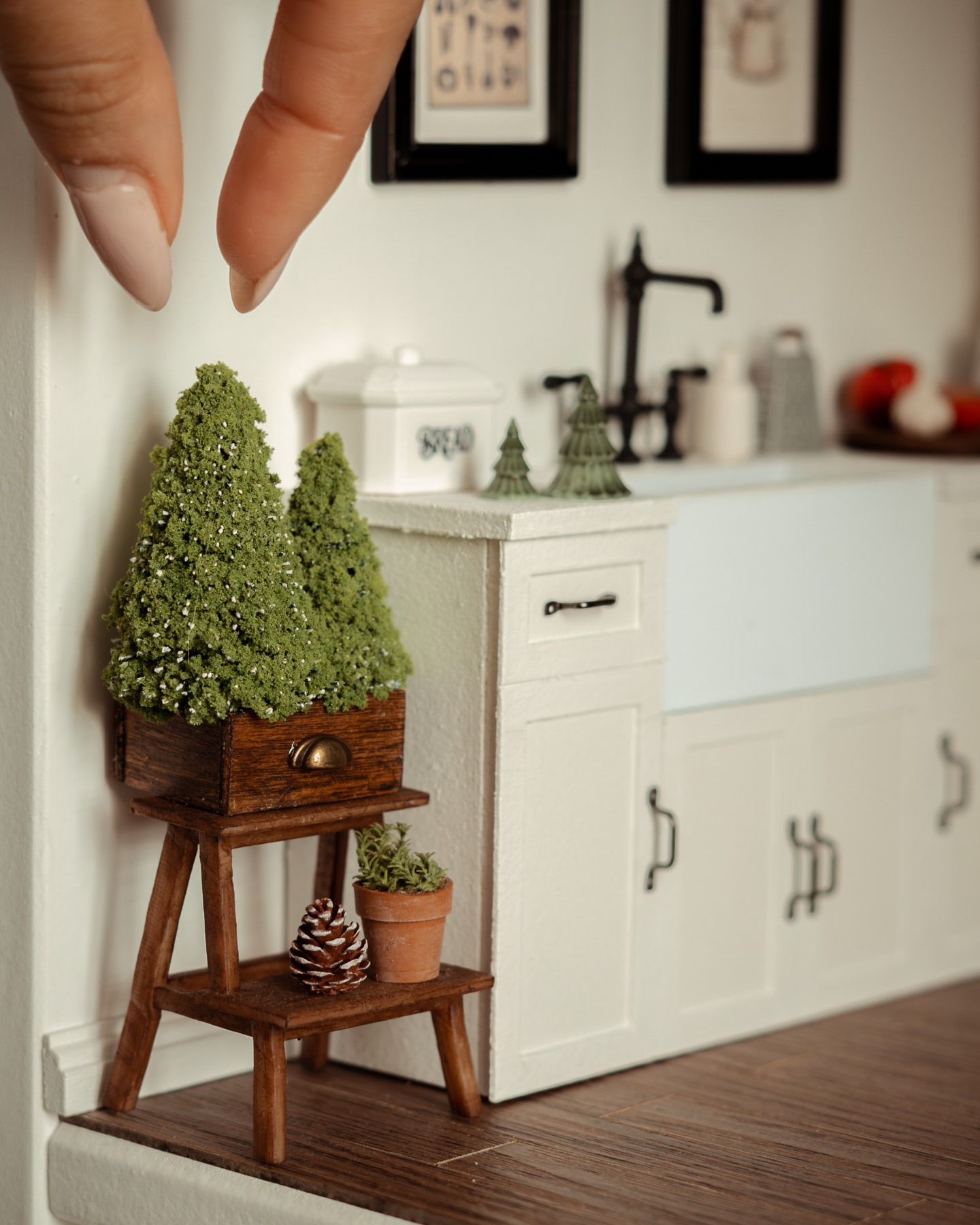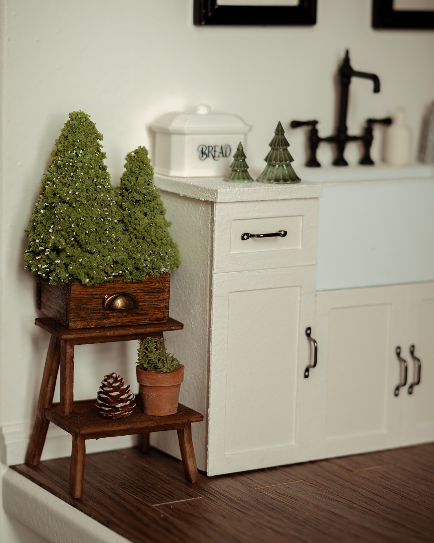 Mini abetos artesanales a escala 1:12 en cajón de madera pintado a mano, con estilo rústico farmhouse y tirador de bronce. Perfectos para decorar casas de muñecas y escenas en miniatura, tanto en interiores como exteriores.
