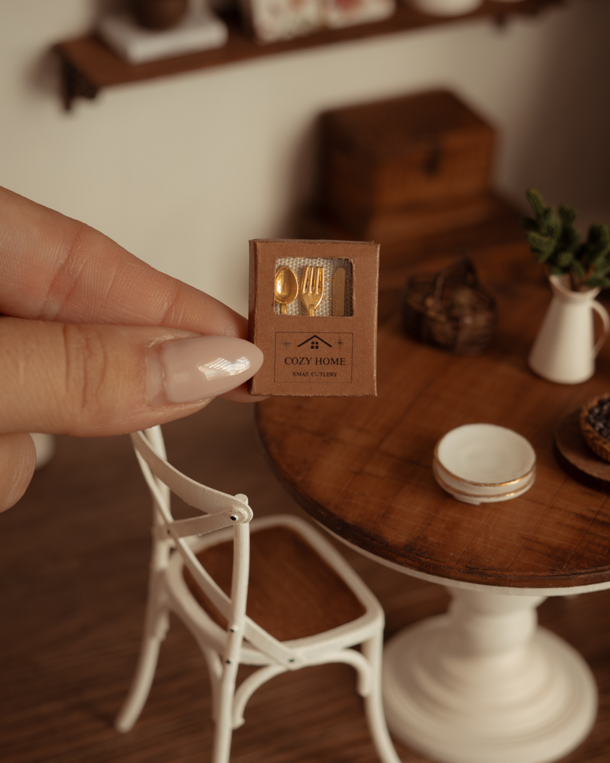 Cubiertos navideños a escala 1:12 en caja con diseño propio y acabado dorado, ideales para casas de muñecas. Perfectos para mesas de cocina o salón, aportan realismo, elegancia y un toque festivo a tus escenas navideñas en miniatura. Cada pieza es artesanal, única y decorativa.