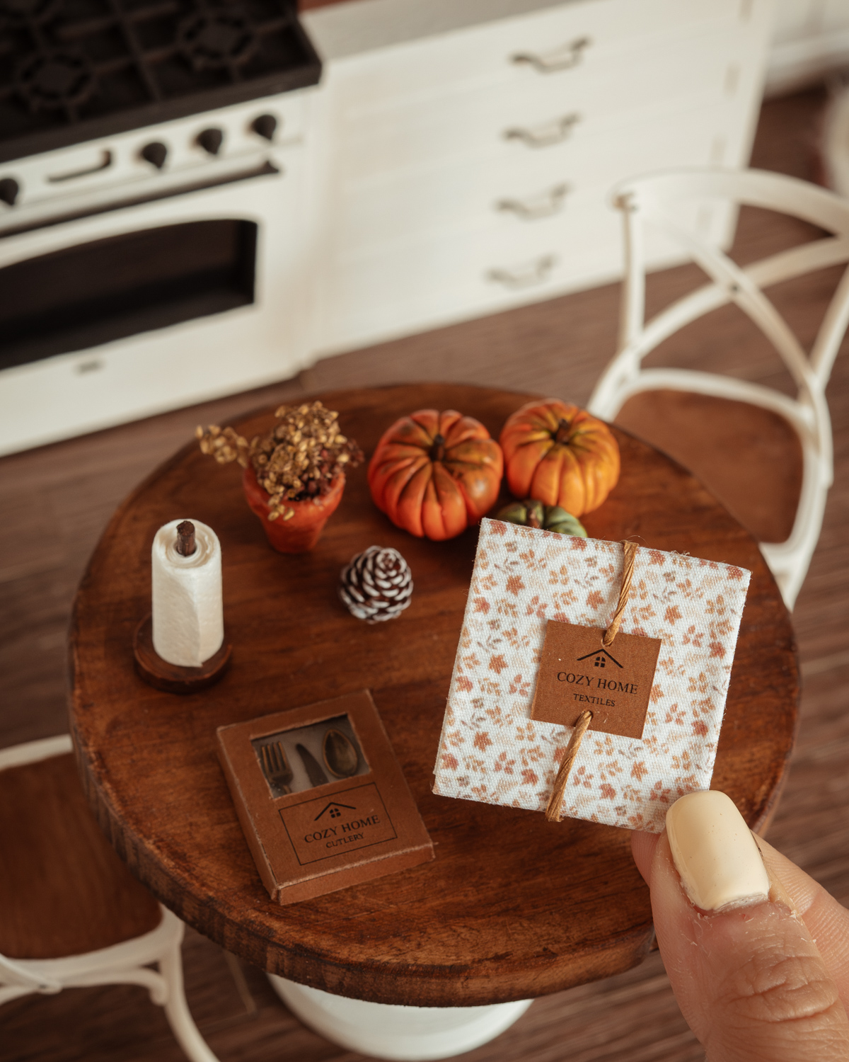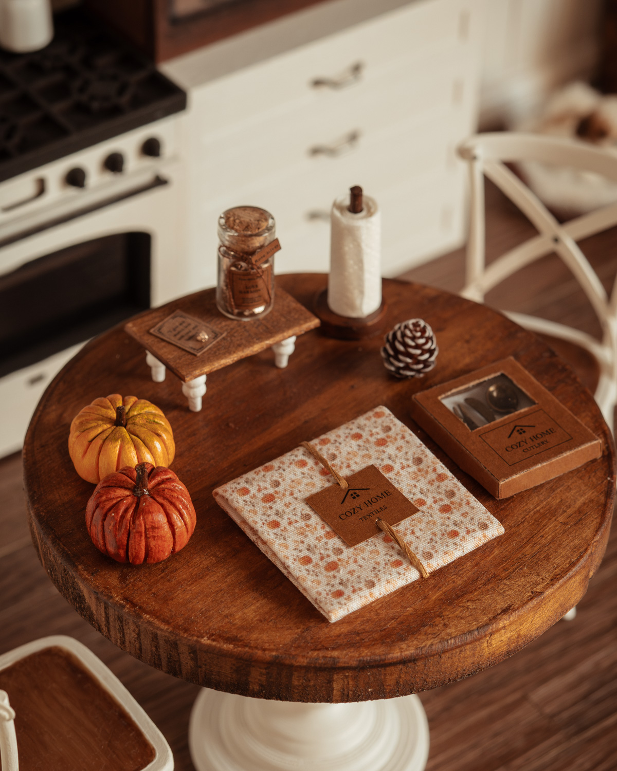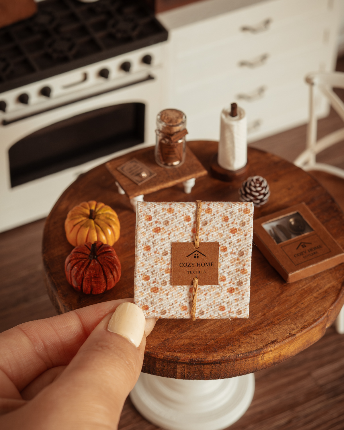 Este mantel a escala 1:12 presenta un diseño propio y exclusivo, cuidadosamente impreso con patrones otoñales de hojas, calabazas o en tonos marrón y beige. La escala de los motivos es perfecta para miniaturas, muy fina y detallada, logrando un realismo excepcional que resulta imposible de encontrar en telas convencionales. La tela es de algodón y el mantel viene presentado con una etiqueta “Cozy Home” dentro de la sección “textiles” y un lazo que permite exhibirlo decorativamente.