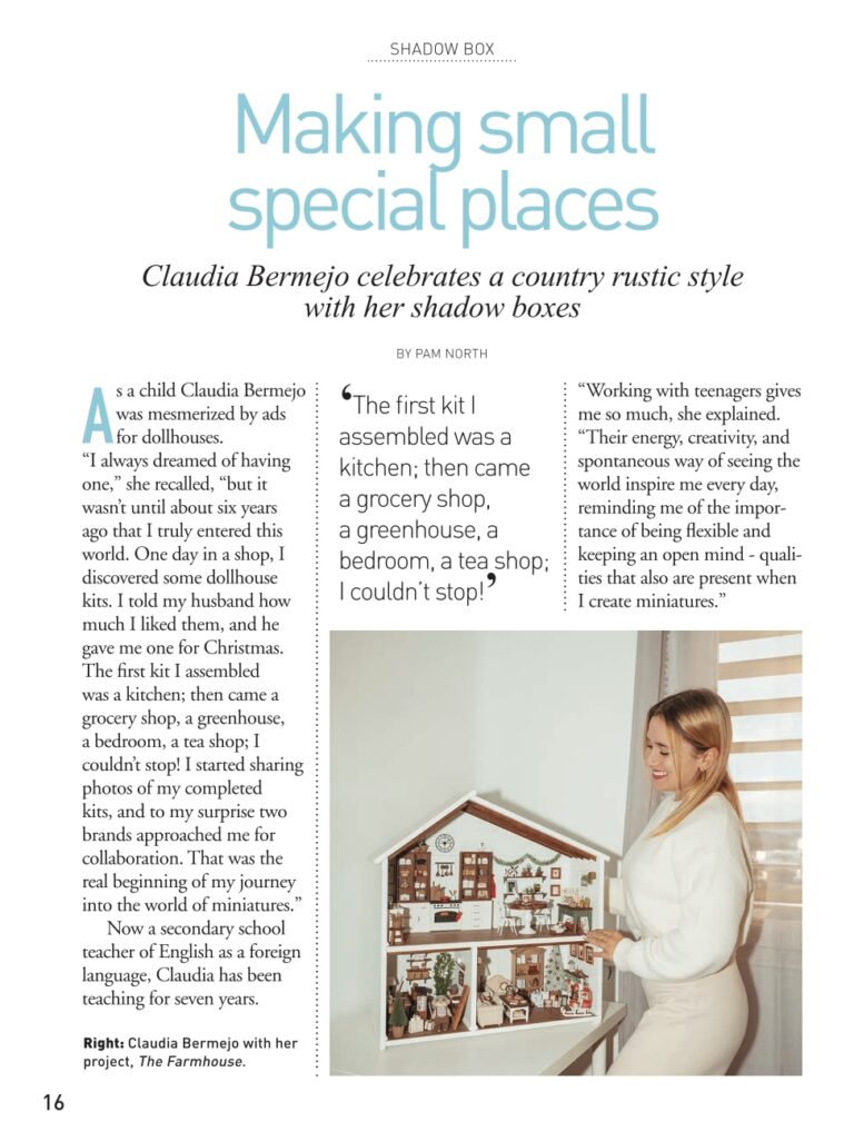 Finalmente, el 14 de enero, el artículo salió publicado en la revista, en la página 16, bajo el título “A Rustic Style”. Ver mis miniaturas en esas páginas, compartiendo espacio con otros artistas que admiro, fue un momento muy especial y emocionante.