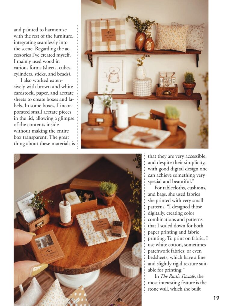Todo comenzó el 24 de noviembre, mientras estaba inmersa en la creación de miniaturas para la feria de marzo de Barcelona, con la inspiración otoñal por todas partes. Ese día, Auralea Krieger, editora de la revista, me contactó por Instagram y me preguntó si estaría interesada en un artículo mostrando mis espacios de miniatura en el siguiente número de la revista. Acepté sin dudarlo, profundamente agradecida por la oportunidad.